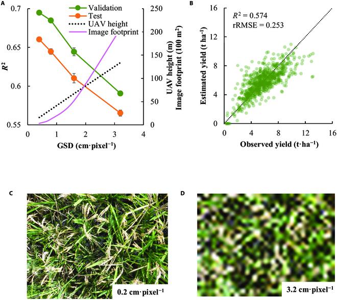 CNN 模型对图像有着较强的分辨能力。当地面采样间隔 (GSD,照片中每个像素点对应的现实距离,与分辨率相反)为 0.2 cm/pixel 时,CNN 模型预测结果和实际结果的相关系数 R2 在 0.65 以上。即使 GSD 增大到 3.2 cm/pixel,模型的 R2 也能保持在 0.55 以上。