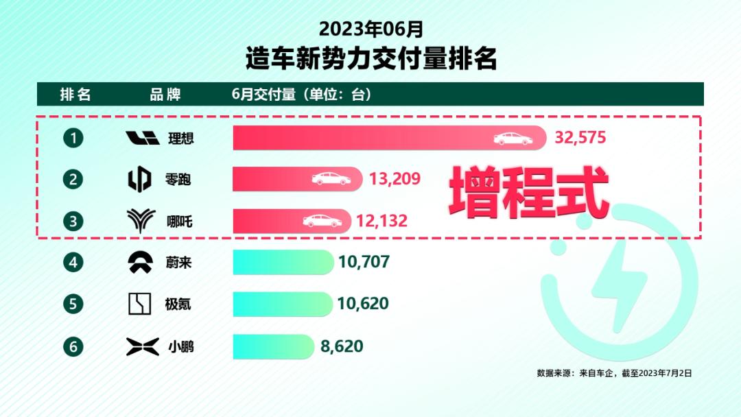 6月新势力造车的销量前三名,理想、零跑、哪吒。都是主要在销售增程车型。