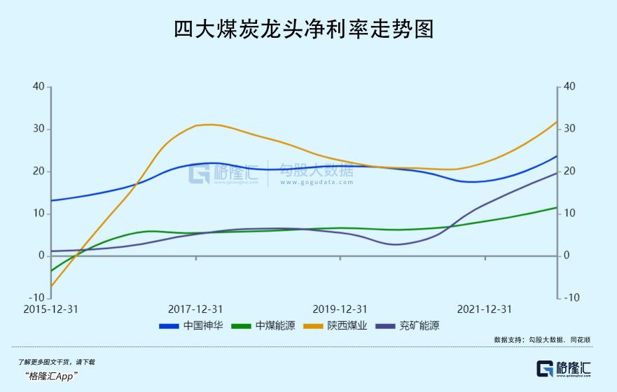 净利率方面,中国神华从13.14%持续提升至23.7%,累计抬升超过10.5%,表现亮眼。当然,陕西煤业也不错,2022年净利率高达31.8%,跃居四大龙头之首。