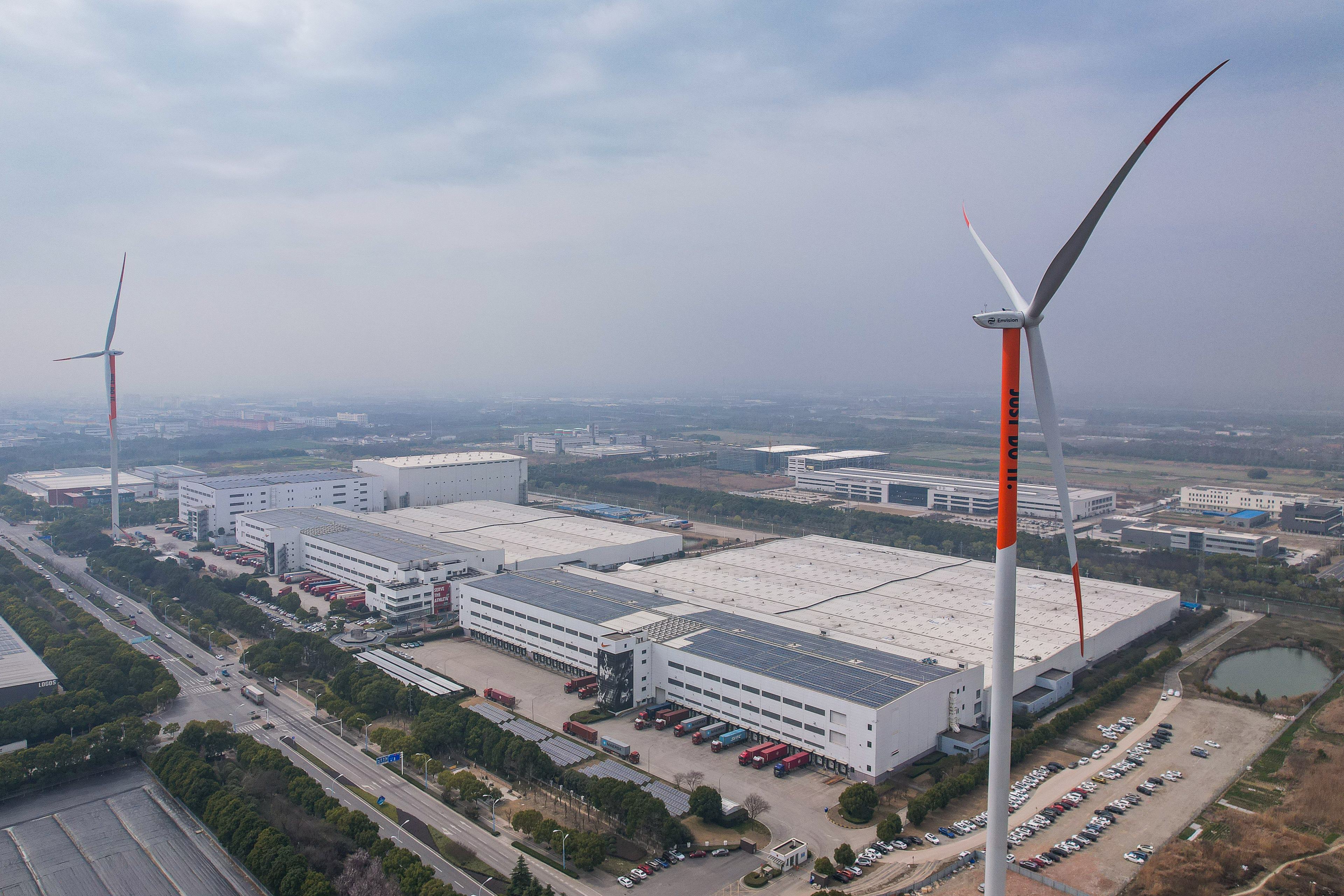在位于江苏太仓的耐克中国物流中心(Nike China Logistics Center,简称CLC),两架140米高的大风车昼夜不停地旋转着。