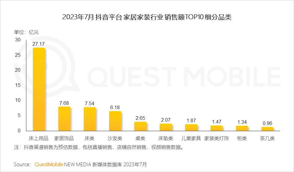 QuestMobile数据显示,2023年7月,床上用品销售额超27亿元,其次是家居饰品,销售额为7.68亿元。