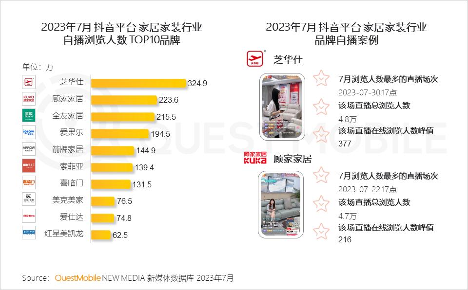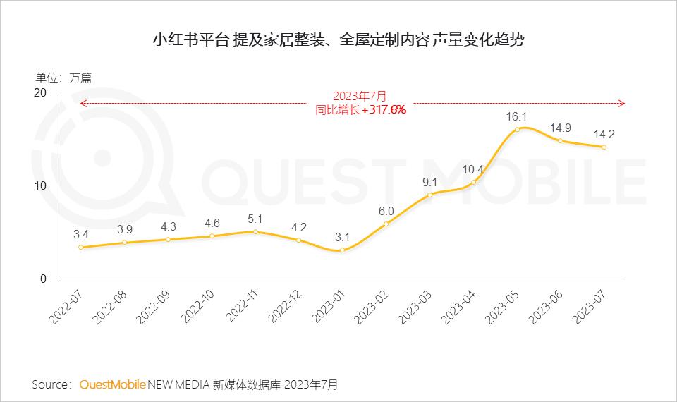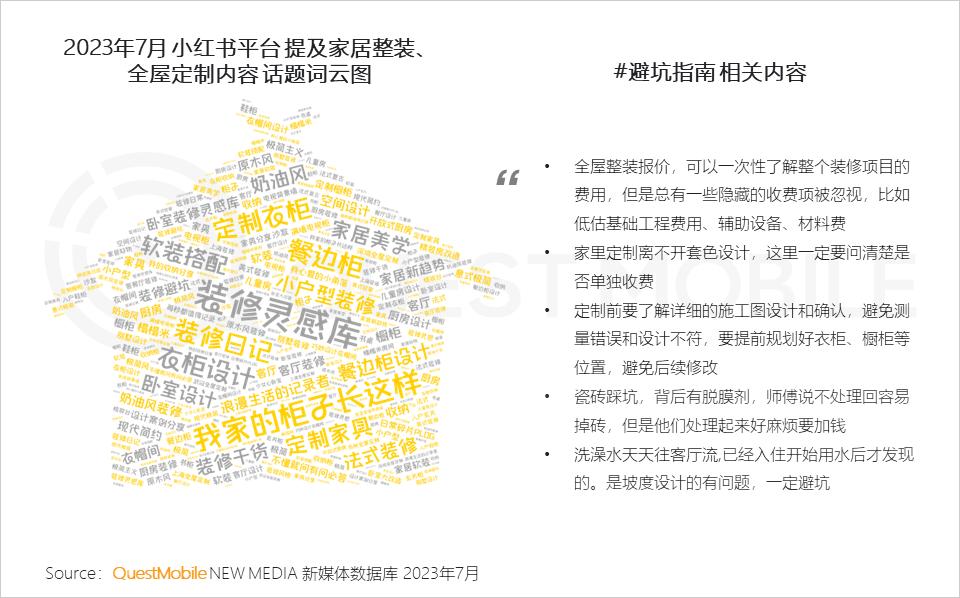 QuestMobile数据显示,2023年7月,抖音、小红书家居家装类内容共触达1.03亿兴趣用户,而品牌APP、小程序的去重活跃用户数仅为2027.2万,这代表着深耕内容平台的战略对家居家装品牌的打造存在意义和价值。