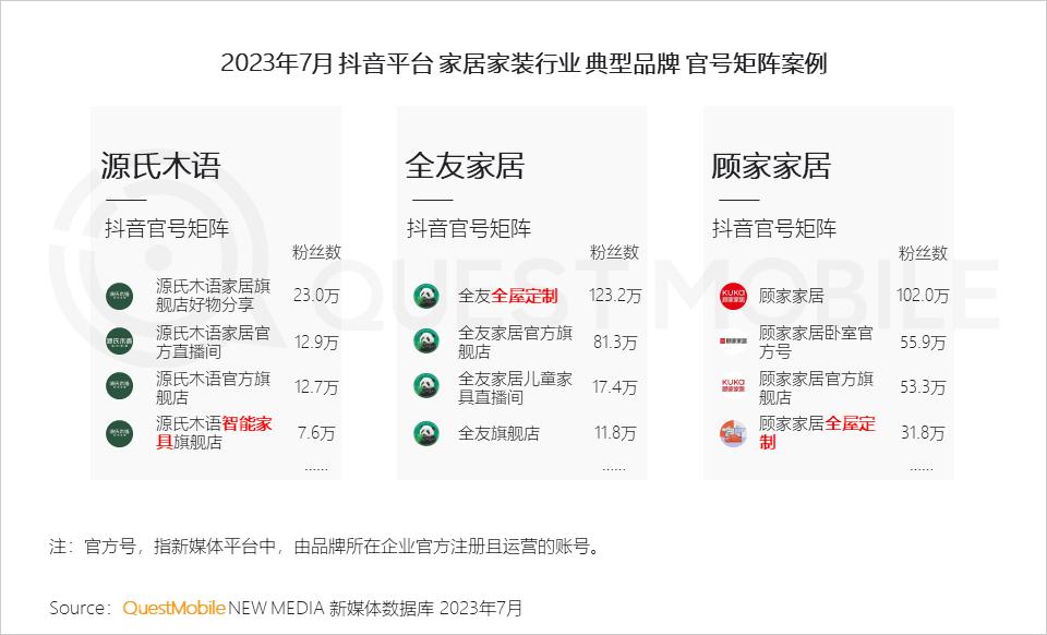 3、私域布局上,多账号并行是各品牌共同特征,其中全屋定制、智能家居类官方账号的独立运营也是对当下家居市场新趋势的一种快速响应