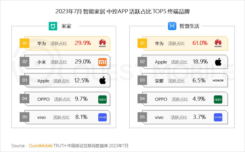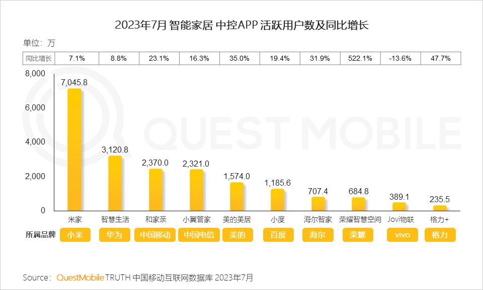 QuestMobile数据显示,小米旗下的米家APP占据最大市场份额,于去年1月上线的荣耀智慧空间APP,凭借机主规模优势,其活跃用户规模在今年迎来爆发式增长。