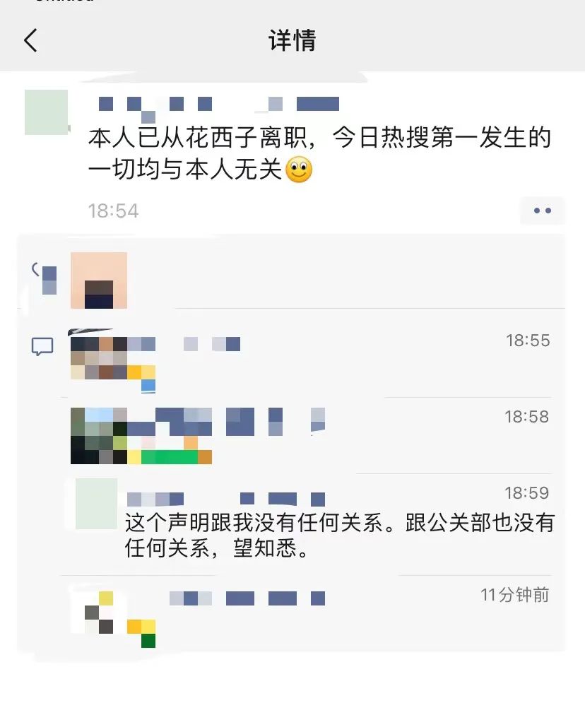 “本人已经从花西子离职,今日热搜发生的一切均与本人无关,这个声明跟我没有任何关系,跟公关部也没有任何关系。”