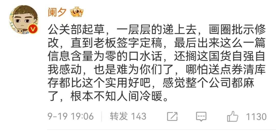 但希望至少这篇对你有点启发吧,尤其你如果是新消费品牌的一把手或者负责品牌公关的vp,请重视公关的同时,别把网友当傻叉。