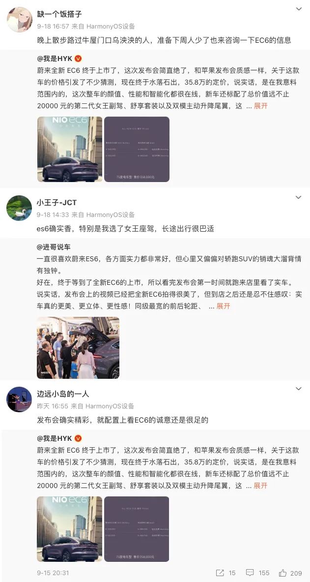 @小王子-JCT 、@缺一个饭搭子、@边远小岛的一人,三位微博博主,不仅都力挺花西子,还都都同时转发了“蔚来全新 EC6 上市”的相关微博,难道大家既是花西子粉丝,又同时是蔚来EC6的粉丝?
