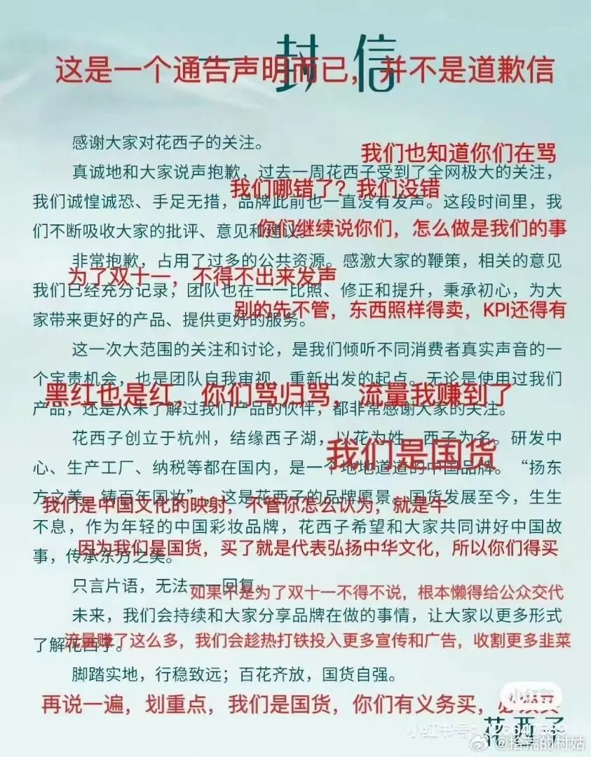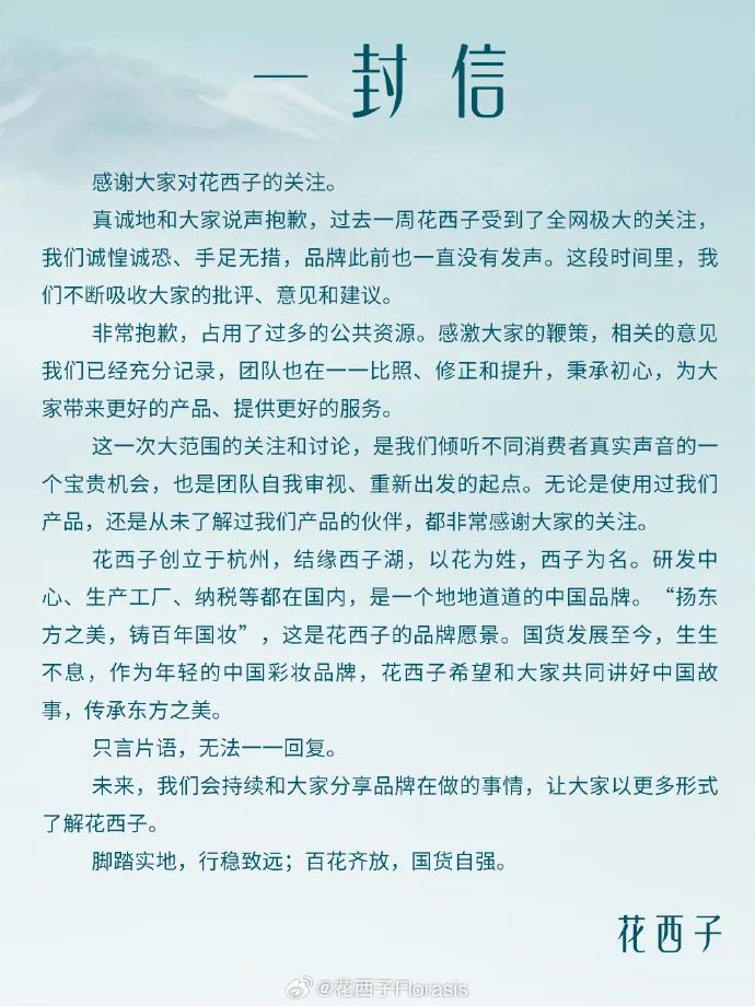 花西子这份声明,拧巴的地方很多,比如标题是“一封信”,全文也只有一句“抱歉”,但文章大段篇幅在讲品牌理念。