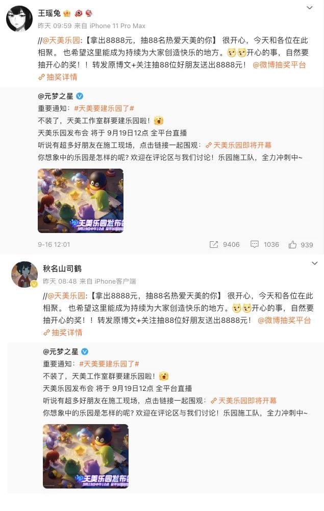 @秋名山司鹤和@王瑶兔都在19日转发了同一条“天美乐园”的微博,两位同时在微博留言力挺花西子的微博账号,竟然在同一天参与了同一个微博的转发?
