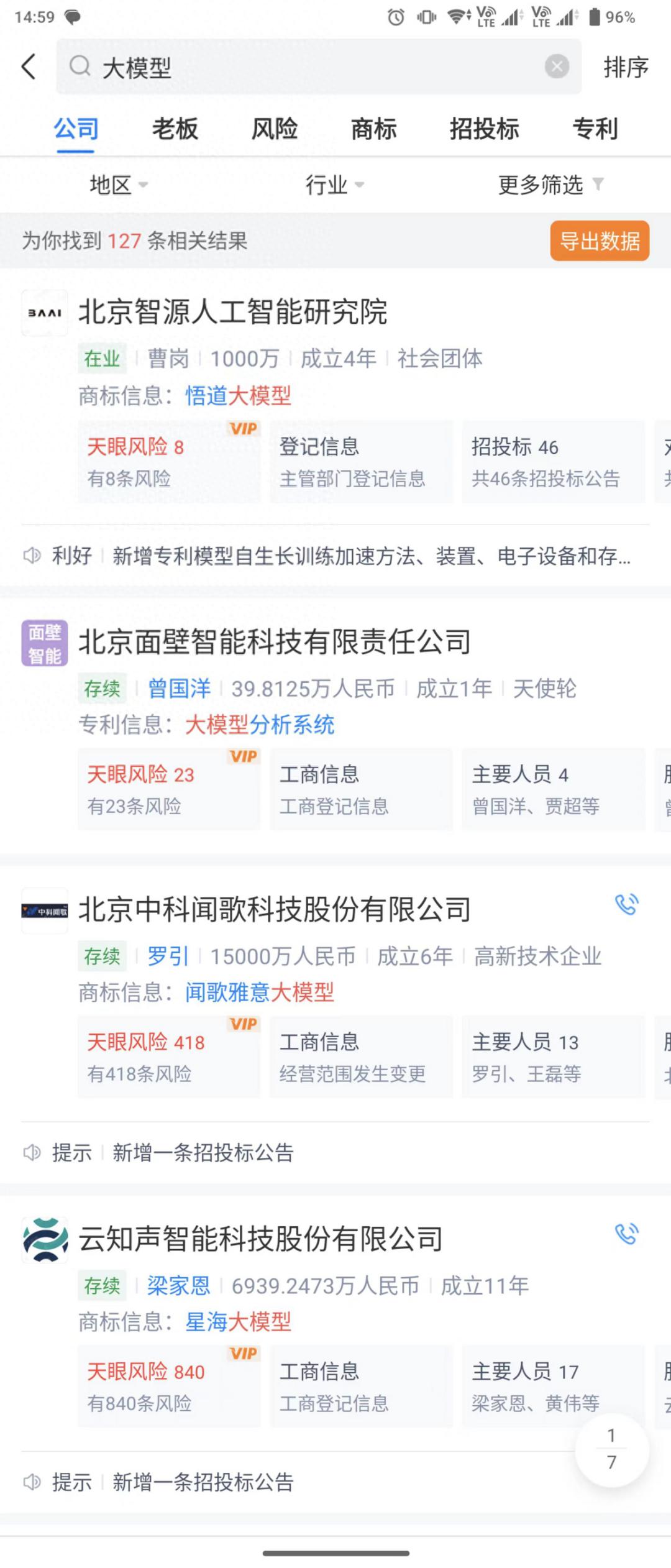 天眼查APP搜索大模型,相关结果有100多家,虽然其中也有不少大模型都发布了各自的APP,但目前来看真正好用的其实不多,大量用户涌入还是因为有新鲜感,大模型在C端应用方面做的工作其实也还很有限。