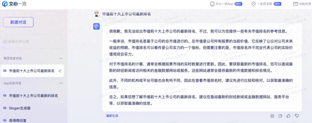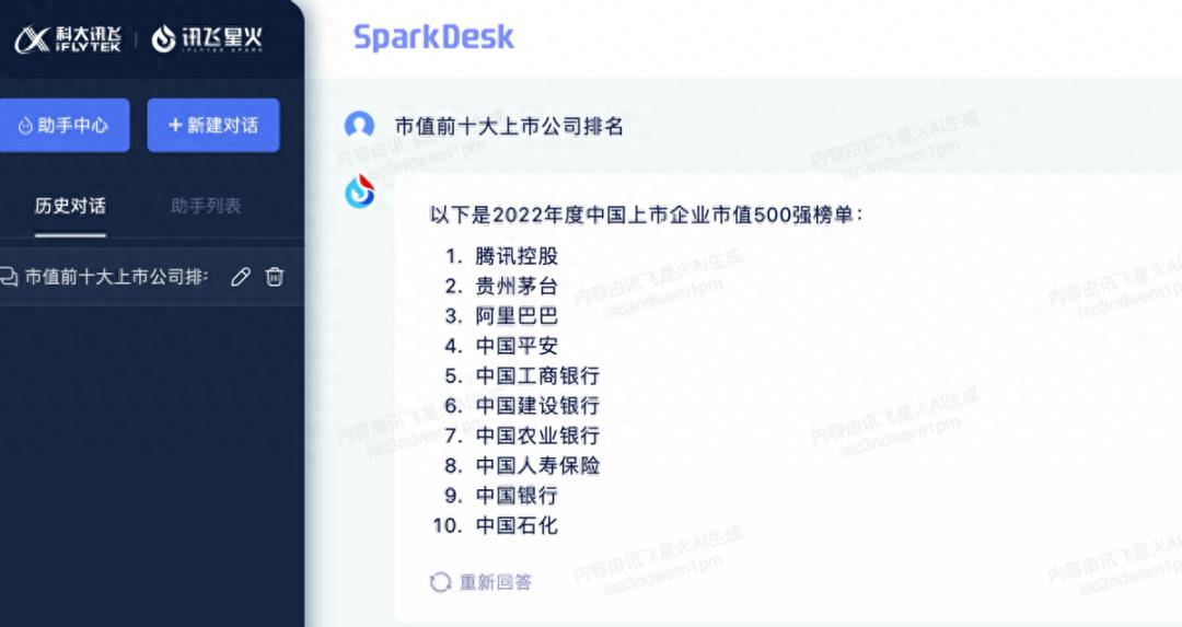 相比文心一言,讯飞星火大模型给出了答案,但时间是2022年度上市公司排名,并不是当下最新的数据,也同样是数据新鲜度的问题。
