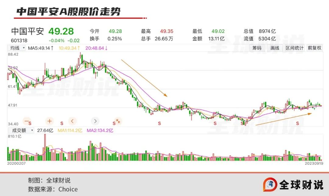 在中报发布后,中国平安股价有所上涨,截至9月19日A股股价收盘报49.28元/股,但较高点仍几近腰斩。