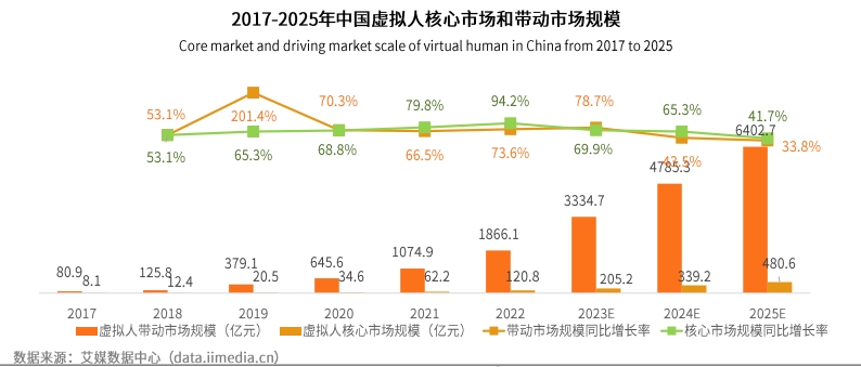 艾媒咨询数据显示,2022年中国虚拟人核心市场规模为120.8亿元,预计2025年将达到480.6亿元,2022年虚拟人带动周边市场规模为1866.1亿元,预计2025年为6402.7亿元。