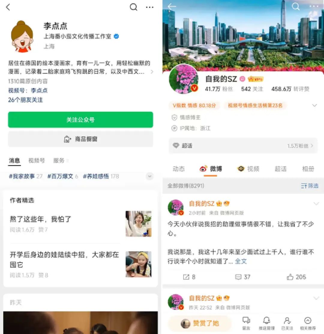 “李点点”是公众号达人,以漫画起家,早在2019年就在公众号积累了超400万粉丝;“自我姐”是微博达人,虽然粉丝只有41万,但身为创业女老板的“自我姐”靠着持续不断的生活、工作分享,积累了一批非常精准的中年高知女性粉丝。