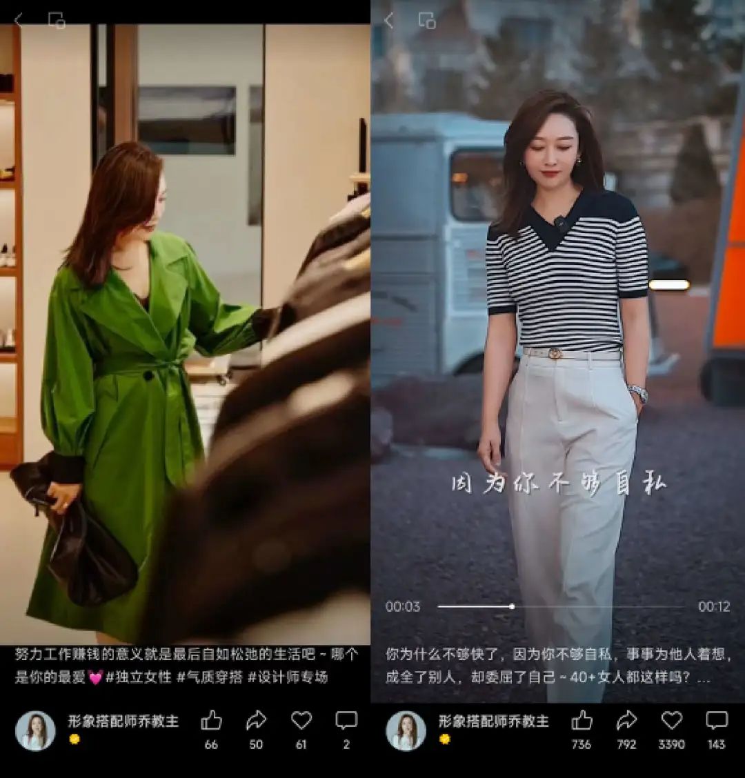 查看“形象搭配师乔教主”的短视频和直播,没有太多剧情,没有321叫卖,更多是不同场景下的穿搭展示和穿搭讲解,很像是一个个动态版的商品详情页。专业的形象穿搭指导,以及背后所代表的中年女性优雅生活,是“形象搭配师乔教主”的核心吸引力。