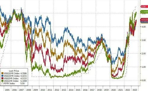 隔夜美债收益率延续近期上行趋势,10年期美债收益率创2007年来最高纪录,2年期收益率也逼近十多年来最高。