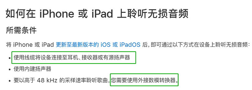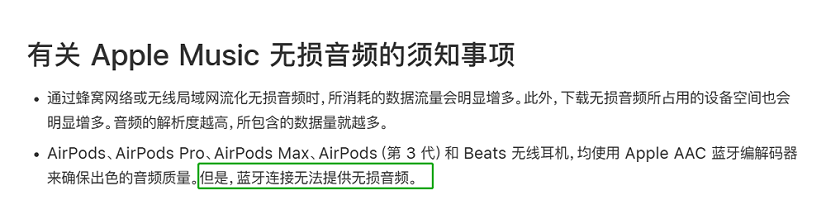 然而,用户付费获取资源,并不意味着得到相应的无损音乐听感,这涉及到音乐格式、传输速度等多个因素。以眼下主流的蓝牙传输为例,苹果官方早已声明蓝牙连接并不支持无损音频;要在iPhone或iPad上听到无损音频,需要使用线缆、外接数模转换器等。