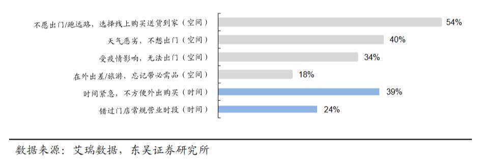 根据东吴证券2020年的消费者调研显示,在消费者采用即时零售购物的影响因素中,空间维度的因素占比,远超过以即时性为主的时间维度。这也意味着和餐饮外卖对于分钟级送达时效性的刚需性需求不同,在即时零售场景中,分钟级时效性可以被更软性的小时达服务取代。