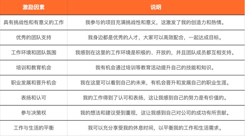 比如看重“具有挑战和有意义的工作+良好的工作环境和团队氛围”或者是看重“培训和教育机会+职业发展和晋升机会+表扬和认可”,等等。