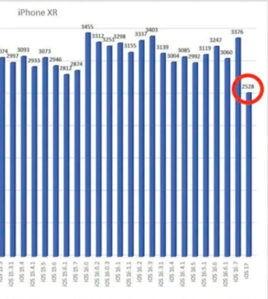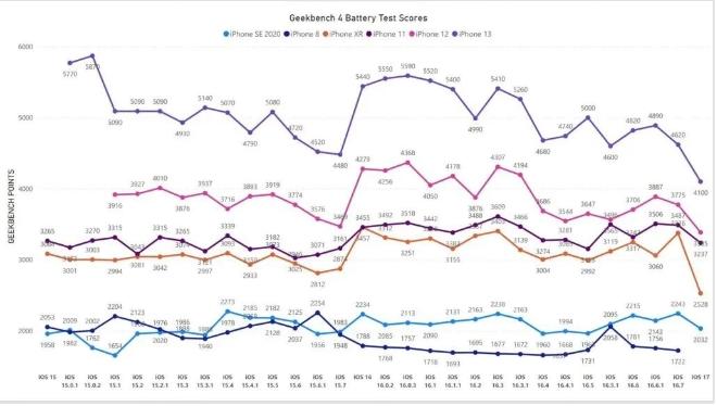 在 iOS 16.3 后,几乎所有老 iPhone 的续航都在稳定下滑,然后在 iOS 17 来了个断崖式下跌。