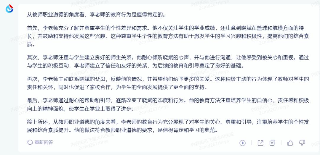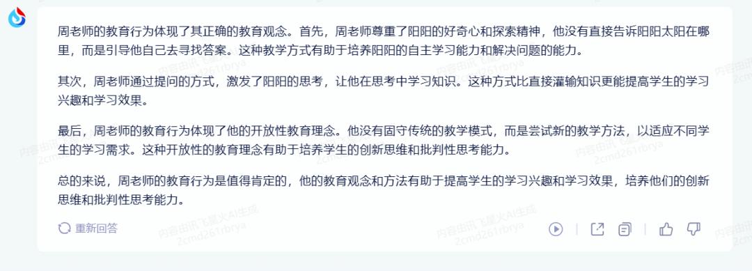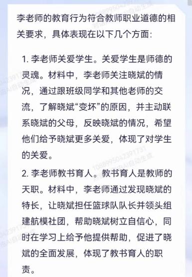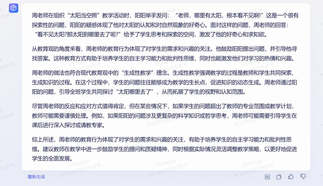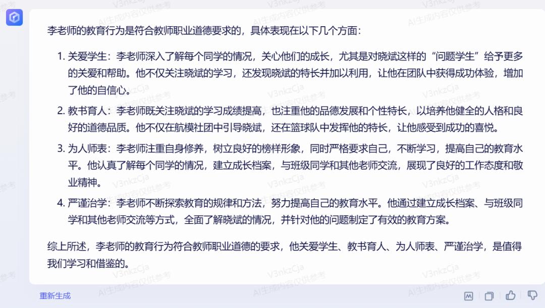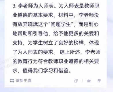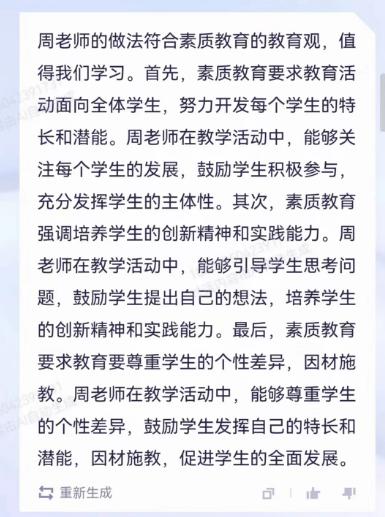 本部分选择了三道综合性题目,分别从教学观念、教育设计和师风引导方面分析大模型的作答能力。从总体的篇幅和结构可以看出,大模型已经比较能够胜任长段落文字的输出,并且均体现了一定的答题技巧和结构,尤其是在「教学设计」一环节,表现得颇为出彩,环节详尽。