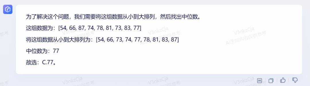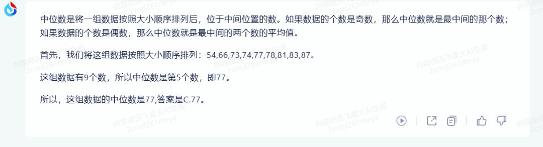 均正确作答,讯飞星火对中位数概念进行了详细的补充,并和文心一言一同给出了作答过程。在诸多对于大模型的测评中,数学能力普遍成为国产大模型的薄弱项,即使是最先进的大语言模型也难以正确地回答大量数学问题。本题因为教资学科常识题,题面设置简单,而面对实际生活中或者数学竞赛题中众多的「弯弯绕绕」,还是要警惕大模型产生的「幻觉」。
