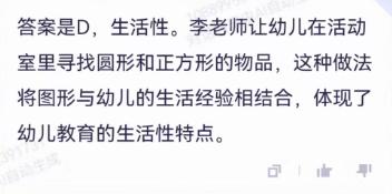 4、在组织活动教学幼儿认识图形时,李老师说:「请小朋友找出活动室里有圆形和正方形的物品」,李老师的做法体现的幼儿教育的特点是( D )。