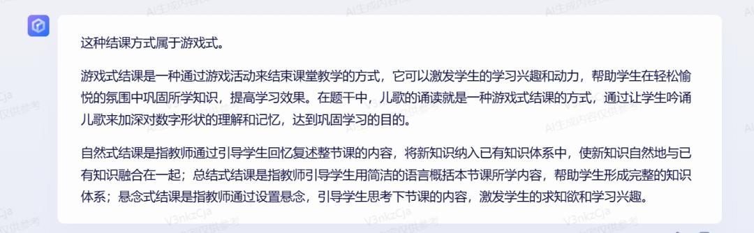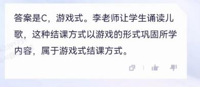6、「 10 以内的数字」一课教学结束时,为巩固所学内容,李老师让学生诵读儿歌:「1 像铅笔细长条, 2 像小鸭水上漂,3 像耳朵听声音, 4 像小旗迎风飘......」这种结课方式属于( C )。