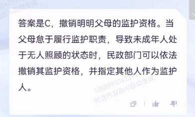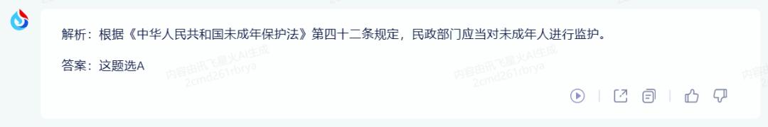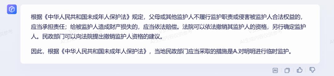 通义千问回答错误。其他两个大模型均引述了《中华人民共和国未成年保护法》条例,讯飞星火具体定位到了条例的第四十二条,而文心一言则对于此列举得更加全面,主体界定更加清晰,同时也指出了 C 混淆选项的错误。对于法院,可以依法撤销监护人的资格;对于民政部门,可以进行临时监护。