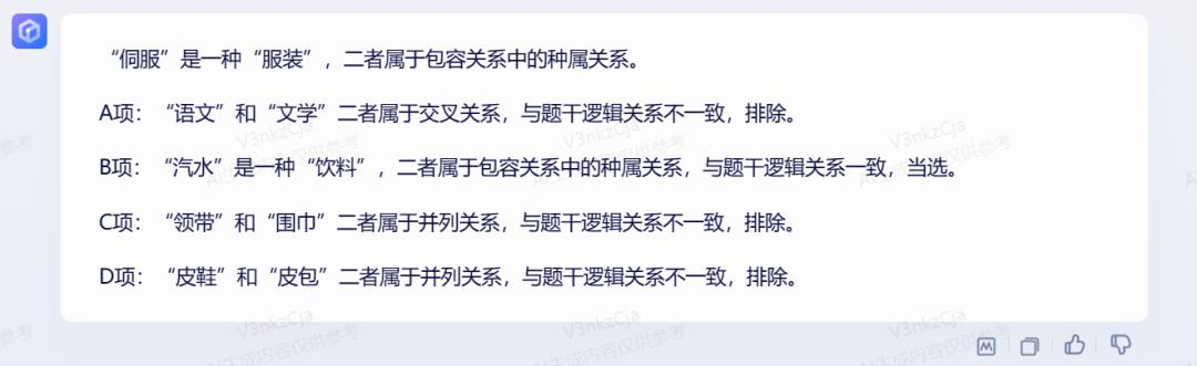 作答均正确,文心一言在答题的基础上对每个选项进行了详尽的说明,包括对于「交叉关系」、「种属关系」和「并列关系」专业名词的解释。