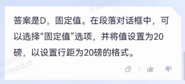 1、在 Word 编辑状态,选择了文档全文,要在段落对话框中设置行距为 20 磅的格式,下列选项中应选择的是( D )。
