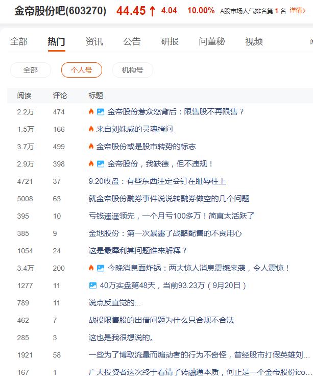 9月20日,金帝股份连续第三日涨停,散户的热议也使其继续“霸榜”A股人气榜第一位。