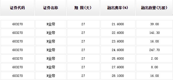 金帝股份上市首日,通过转融通的“转融券”业务借给“空头”的证券,将于9月28日到期。中证金融数据显示,这些券的年化融出费率最低不低于20%,最高达28.1%,期限均为27天。