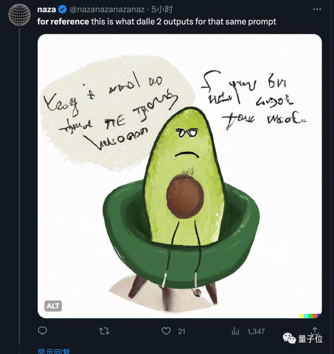 有网友去试了同样的提示词用在DALL·E 2的效果,只能说字也不对、牛油果中间的洞没话出来,治疗是更是没有……
