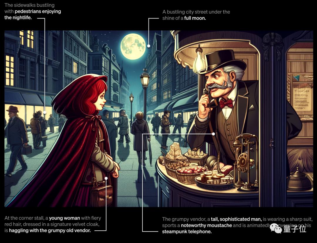 除了基础细节,DALL·E 3甚至能将模糊的形容词如繁华、讨价还价、脾气暴躁演绎得活灵活现,和CLIP已经不在一个档次了。