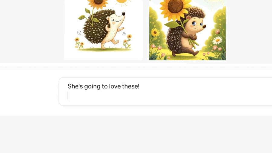 家长选择其中偏童话插图风格的一张后,故事的主角小刺猬形象似乎就能固定下来了,可以继续请ChatGPT画出更多。
