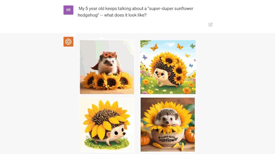 首先家长询问ChatGPT,“我家5岁宝宝一直在说一个’超级向日葵刺猬’,它该长什么样?”