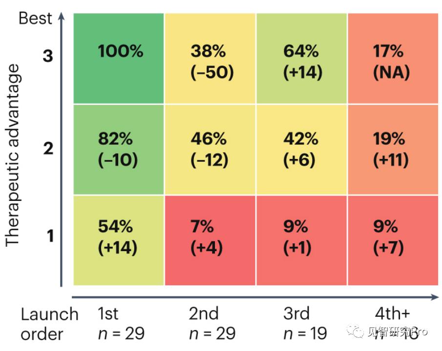 即便是效果最为一般的产品,只要它们能赶在其他产品之前上市,便能捕获到54%的市场价值,这比稍晚但疗效更好的产品(38%)要高出一个不小的差距—14个百分点。