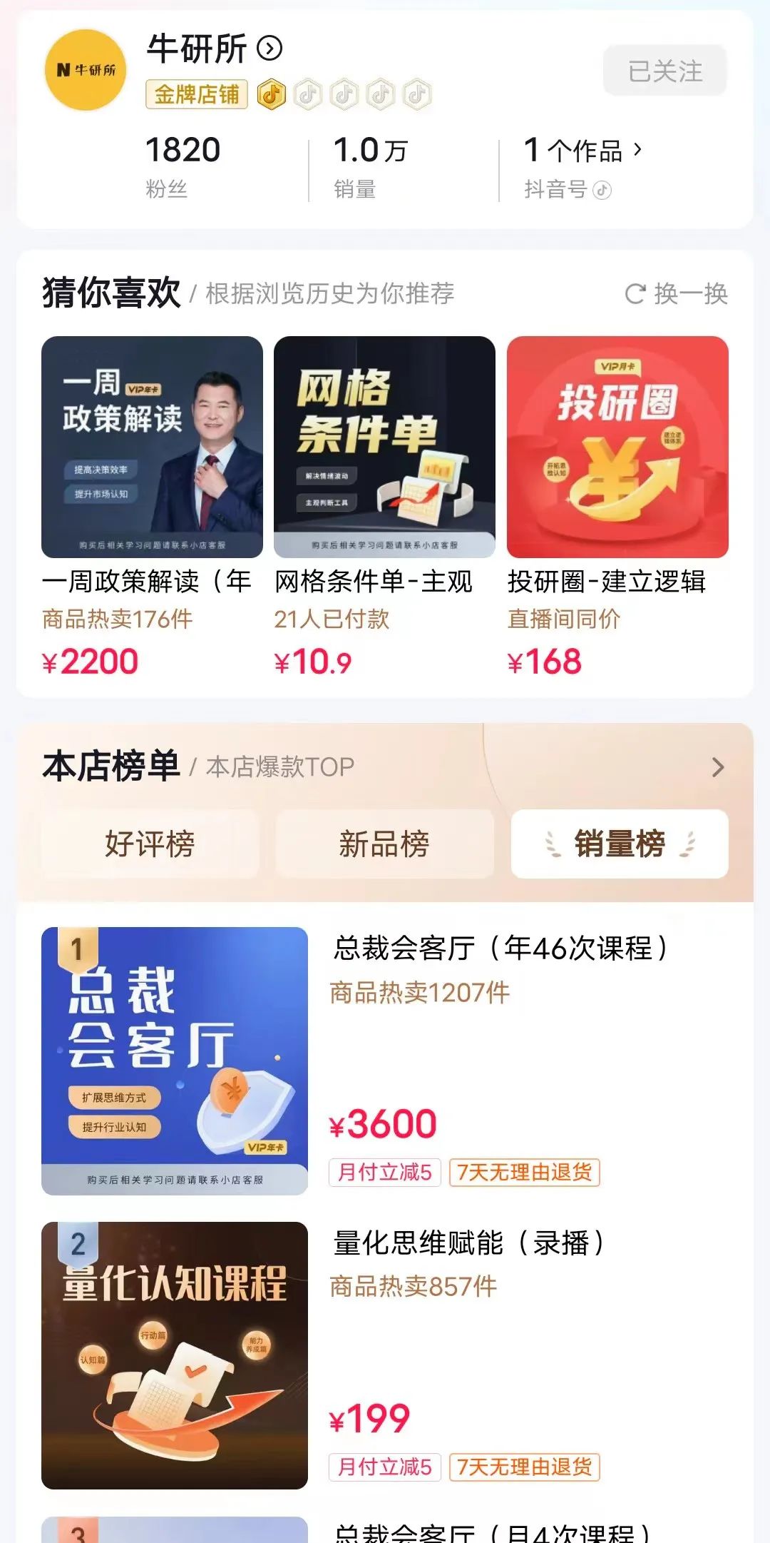 从变现情况来看,中新经纬梳理发现,目前牛壮主要的商业活动在“牛得林奇”账号。目前该账号带货橱窗里有7件商品,均属于教育培训类课程,已售9788件,跟买人数4819。其中单价最高的是总裁会客厅(年46次课程),售价3600元,已售1207。该课程内容主要分享市场策略、宏观环境、大消费等行业以及中特估等非银的投资策略。