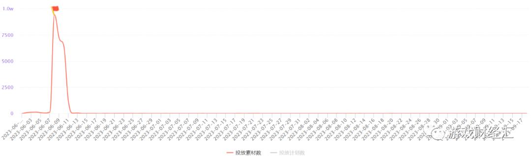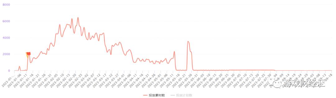 投放侧,《超凡先锋》投放只有一波流,公测当天投放了9000多组素材,《我的起源》虽持续投放,但单日投放素材数较低。