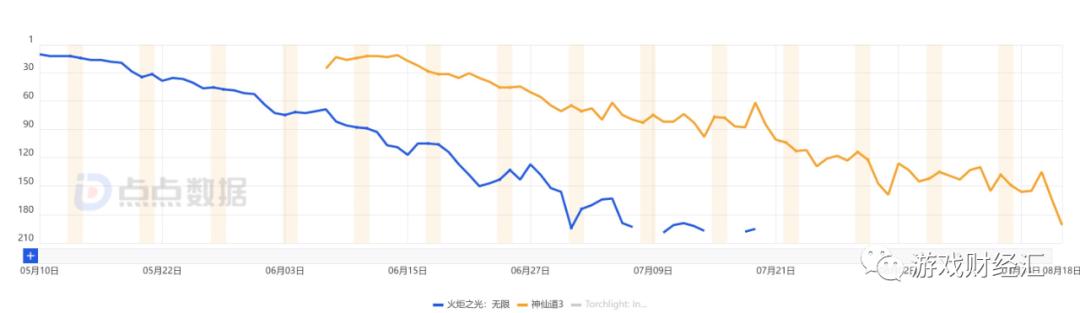 图: 《神仙道3》《火炬之光: 无限》iOS游戏畅销榜排名; 来源: 点点数据
