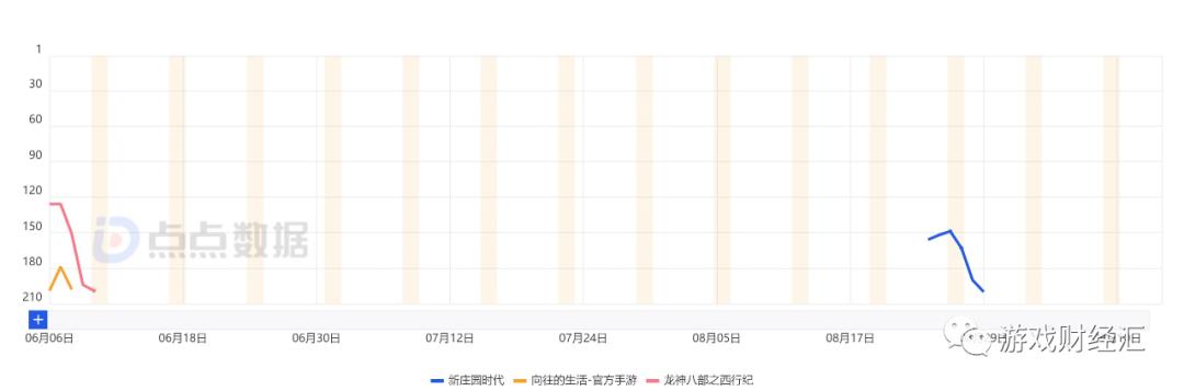 图: 《向往的生活》《龙神八部之西行纪》《新庄园时代》iOS游戏畅销榜排名; 来源: 点点数据