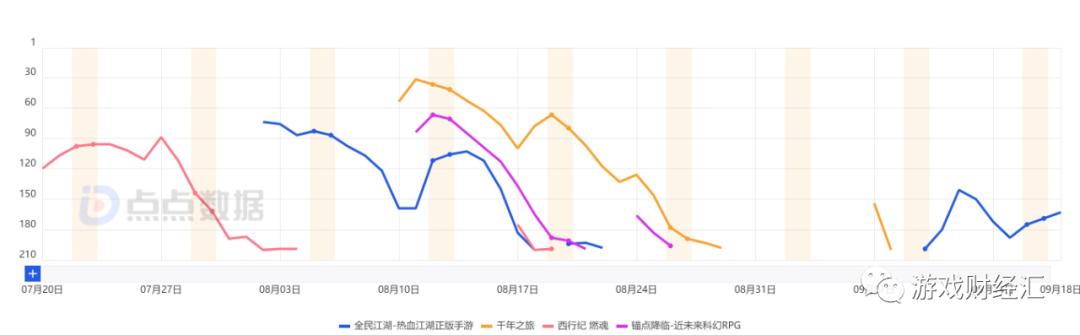 图: 《西行纪: 燃魂》《锚点降临》《全民江湖》《千年之旅》iOS游戏畅销榜排名; 来源: 点点数据