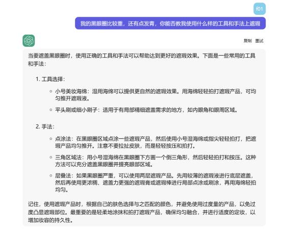 但当输入给ChatGPT一个较为精细的定制化问题时:“黑眼圈很重,还发青,用什么样的工具和手法才能完美遮住?”AI老师仿佛只会将适合大众的方法输出出来,无法再根据问题给予完美的回答。