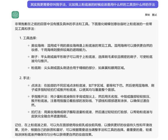 除此之外,ChatGPT也会教学化妆的手法,例如当我们需要了解上粉底的知识时,输入问题类似于“上粉底液的时候应该用什么样的工具或什么样的手法?”,然后ChatGPT就会给出一套完整的教学方案;