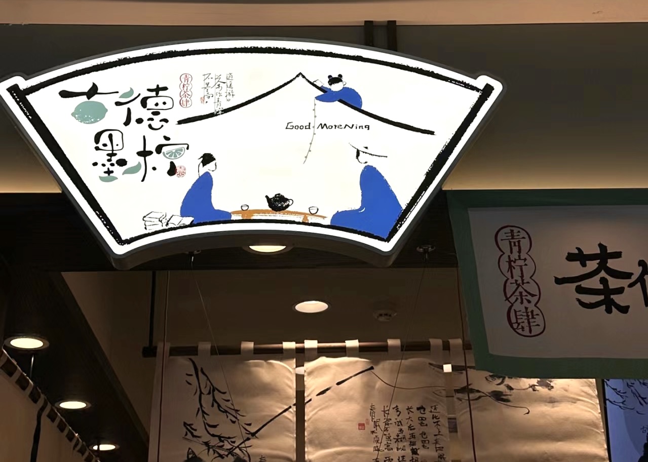 走进古德墨柠的门店,扑面而来的是一贯的“复古国风”。视觉设计以更淡雅的天青色和白色为主,布置有多个木框字画、扇形的古风字画板等,板子上能看到品牌的三个IP人物:古德先生、墨秀才、锁柠儿,三人均身着蓝色袍子,其中两人围坐闲谈,一人在旁游玩,兼具典雅和趣味感。