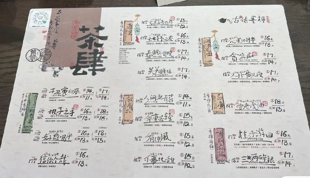 相较之下,古德墨柠的菜单有些“晦涩”,也少了些“夏季气息”:子丑寅卯辰、执子之手、碌碌有为、云舒云卷、春眠不觉晓、贪嗔痴、爱老虎油,这都是出现在“茶肆”菜单上的产品名称,所有产品被归类为古典青柠茶、青柠乳茶、青柠特调等系列,售价多在14~17元/杯,其中乳茶系列占比最大、同时支持热饮和冰饮。