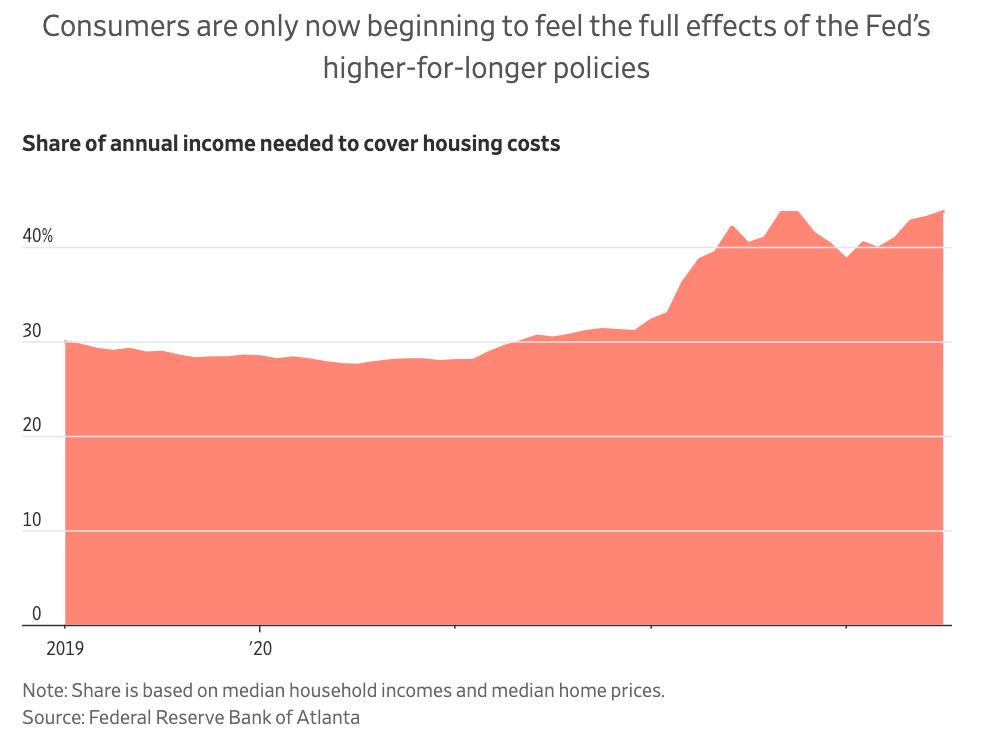 高利率可能会使每月的抵押贷款支付增加数百美元或更多,而且自疫情开始以来,房价仍在大幅上涨。亚特兰大联邦储备银行)的数据显示,截至今年7月,美国中等收入家庭需要44%的收入来支付一套中等价位住房的年付款。这是自2006年以来有数据记录以来的最高水平。