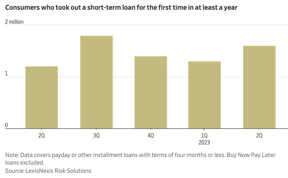 越来越多的美国人转向发薪日贷款和其他短期贷款,这些贷款往往具有超高的利率。根据LexisNexis Risk Solutions的数据,今年第二季度,超过160万美国人在一年或更长时间内首次申请了至少一项此类贷款。这比去年同期增长了35%。