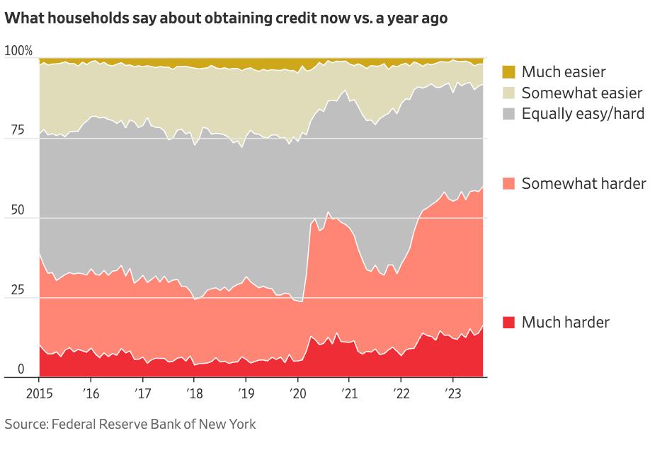 与此同时,传统贷款越来越难获得。纽约联邦储备银行的数据显示,近60%的家庭表示,最近比一年前更难获得信贷。这是2013年以来有数据记录以来的最高水平。